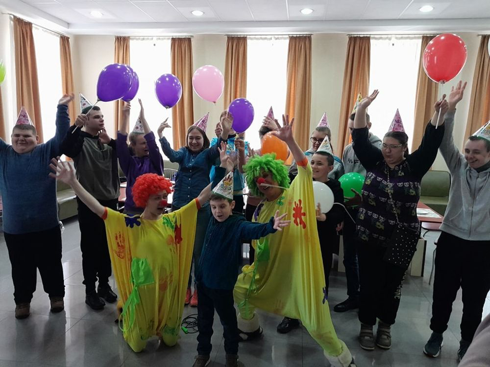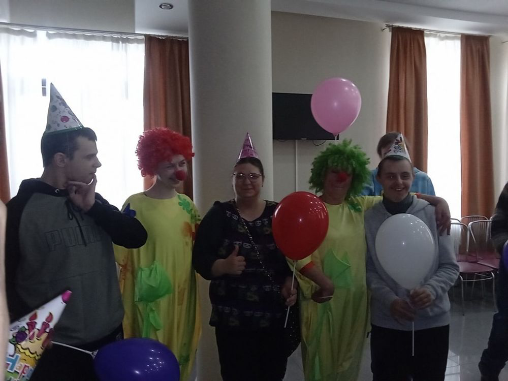 Довелося справжніми чарівниками, нашими волонтерами, які запросили веселих клоунів для Русланчика та його друзів з молодіжного клубу «Без обмежень». Зустріч з клоунами була повною несподіванкою для хлопчика та його запрошених друзів. Здивовані очі дітей, іскри радості та щирий сміх від ігор та веселих танців стали для нас великою і цінною нагородою.
